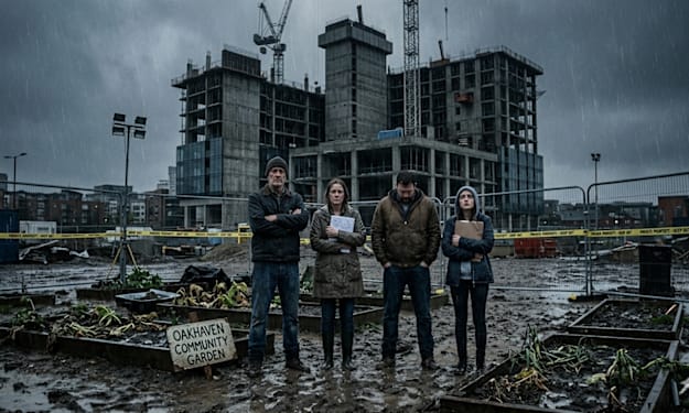 The rain in Oakhaven didn’t wash things clean; it just turned the town’s secrets into a thick, grey sludge. Elias Thorne stood in the center of the derelict community garden, his boots sinking into the sodden earth. Beside him stood his three closest allies: Sarah, a former schoolteacher with kind eyes; Julian, a local carpenter who believed in the weight of a handshake; and Maya, a young idealist who thought the law was a shield rather than a weapon.